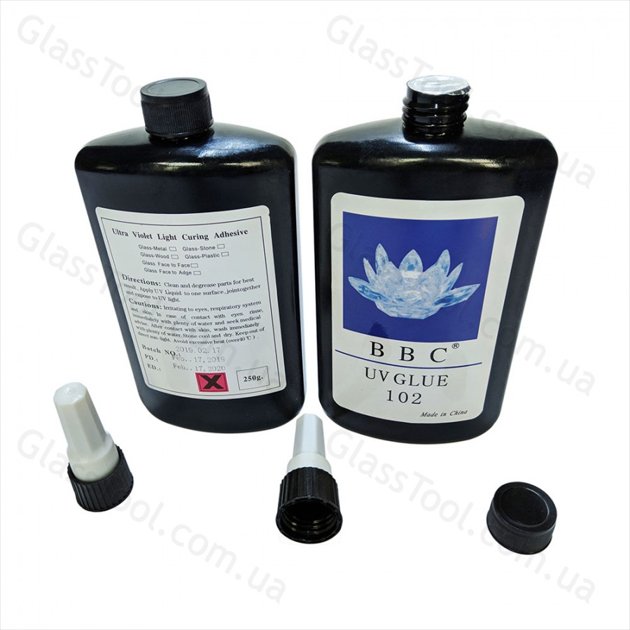 Клей ультрафіолетовий BBC UV GLUE 102 низької в'язкості аплікаційний для склеювання скла. 250мл. Активується при попаданні на нього ультрафіолетових промінів. Це може бути сонячне світло, або проміні ультрафіолетової лампи.